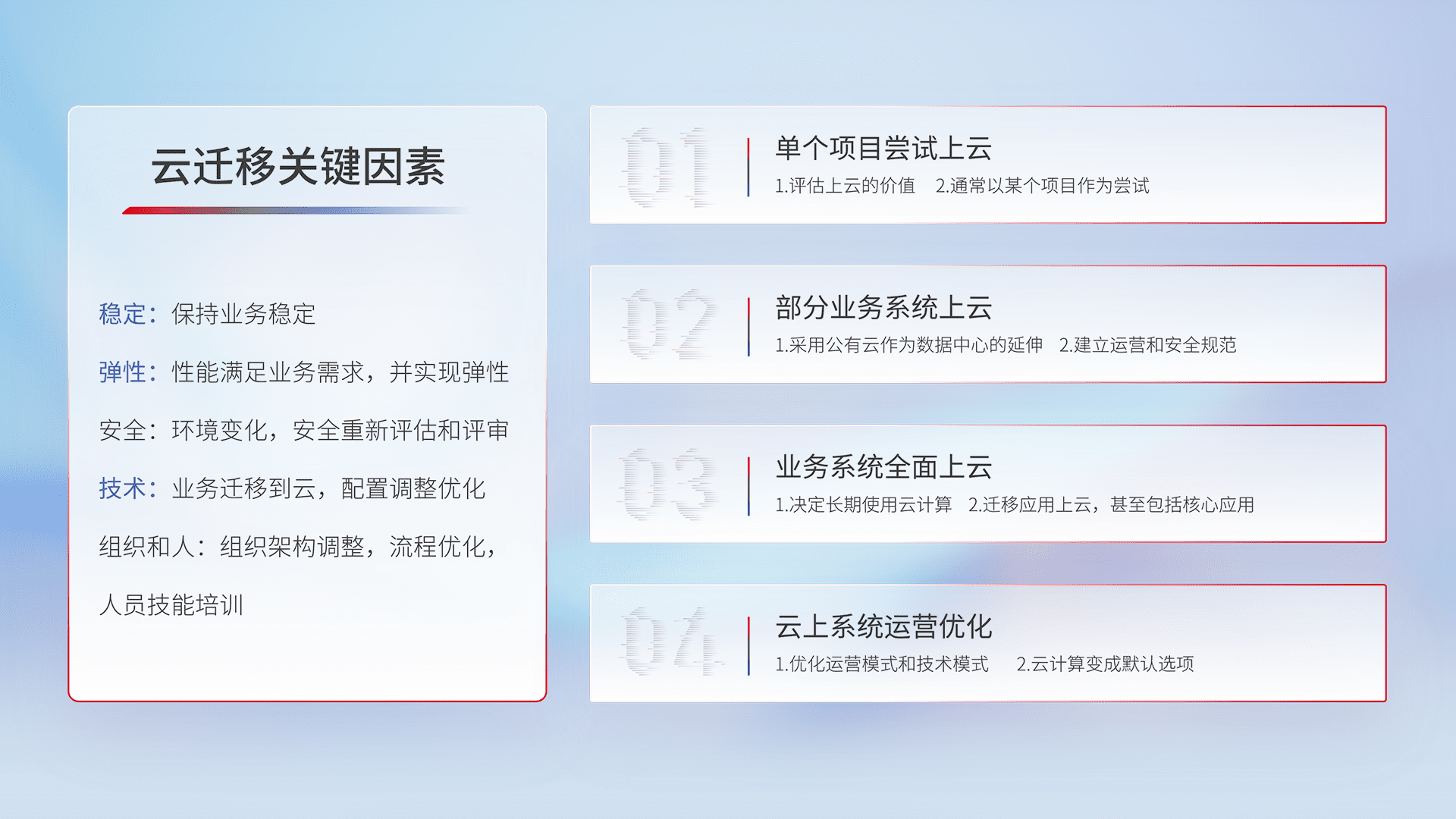 结合实际业务,,,从规划设计、、、云平台选型、、、、云原生改造、、、、数据迁移、、、集成交付,,迁移全过程为客户识别最佳上云路径,,,,做好风险识别管理,,,,设计网络架构、、身份权限、、安全审计合规、、、、操作审计、、、、日志审计、、监控告警策略、、、多站点容灾设计等,,对云上基础设施进行整体规划,,,提升IT治理水平,,,以满足弹性、、、、高可用、、高性能的需求。。。